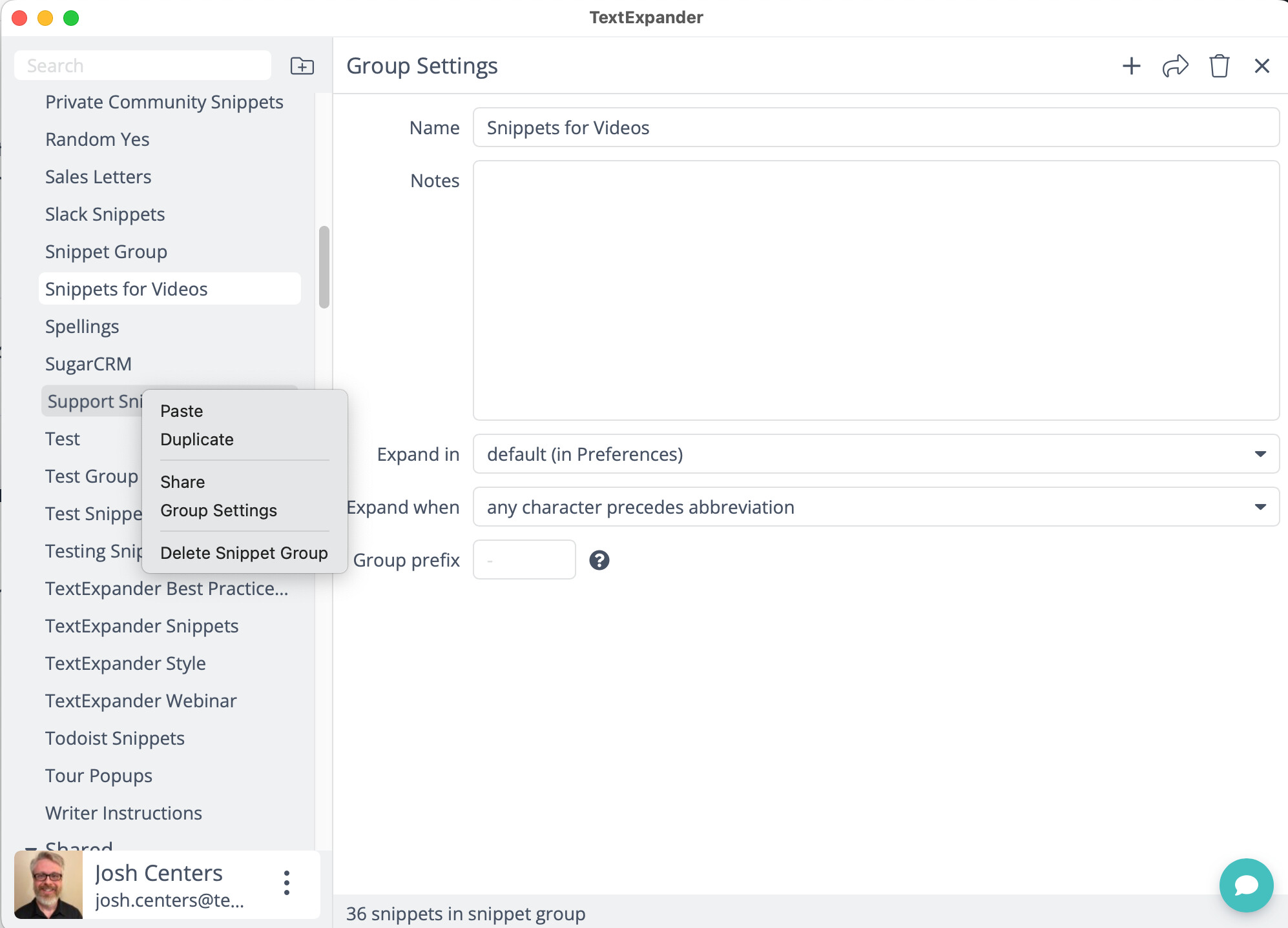 You can disable expansion in an app for a Snippet group by right-clicking the Snippet group and selecting Group Settings.